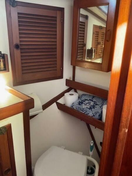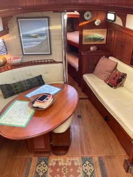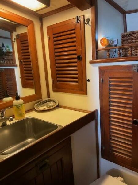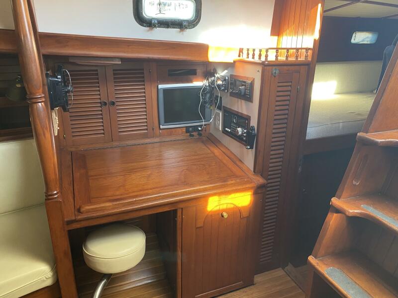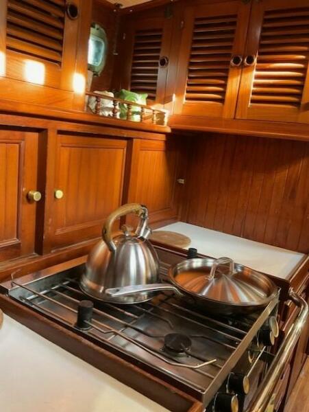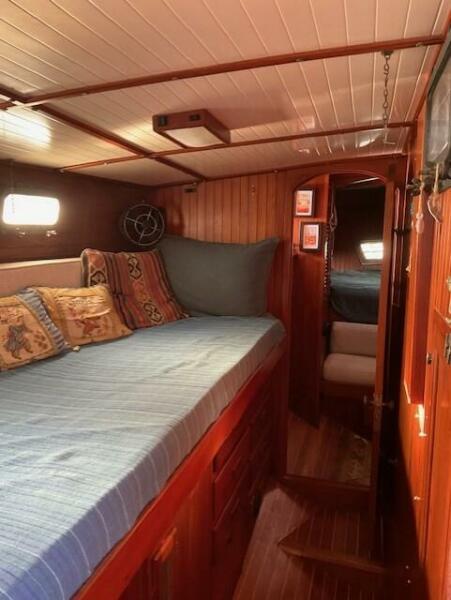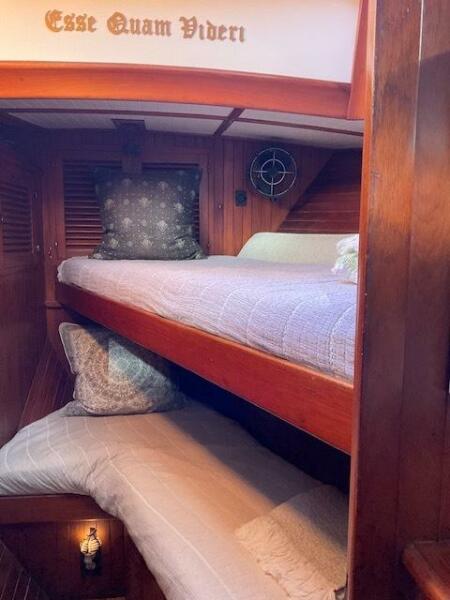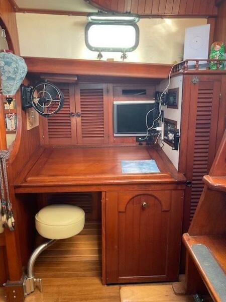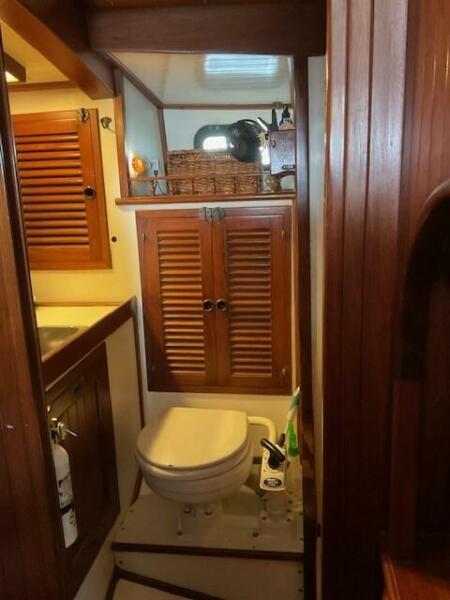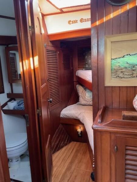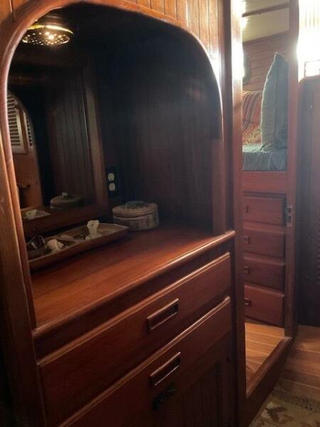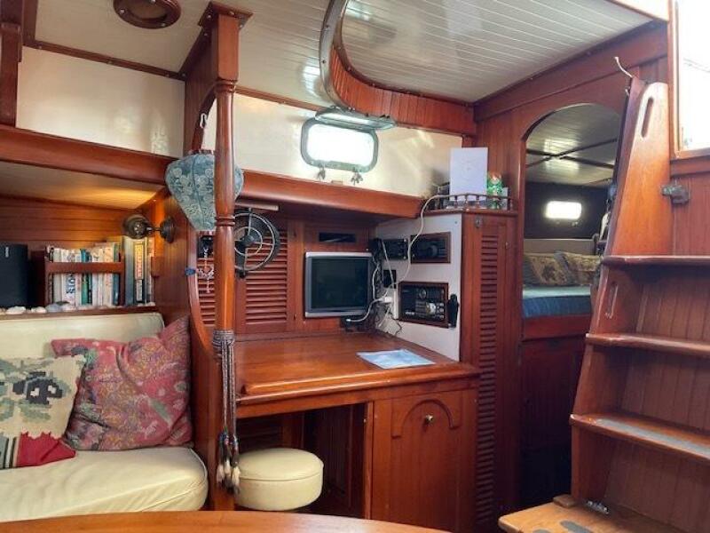 Jack N. Chen founded the shipyard Bluewater Yacht Builders in Taiwan and produced Vagabond sailing yachts during the 1970’s and 1980’s. The earliest sold Vagabond listed in the brokerage records is a 1974 Vagabond 47. The next earliest is a 1976 Vagabond 39 that we, Jordan Yachts, sold in ’06 I can proudly say. The subject of this review, the George Stadel designed 42-footer, was produced from 1978 until at least 1991. Hull #1 was delivered in late 1978 and was a cutter rigged version. She and her sisters, the 47, 39, and 52, share the classic charms of pirate ship inspired detailing from their clipper, trail boarded bows to square windowed sterns. An exuberant use of teak makes these stout under sail (the 42 is rated at 32,000 pounds displacement) and elegant down below.